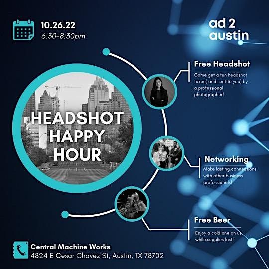 Headshot Happy Hour happening at Central Machine Works 4824 East Cesar Chavez Street Austin United States on Wed Oct 26 2022 at 0630 pm to 0830 pm.